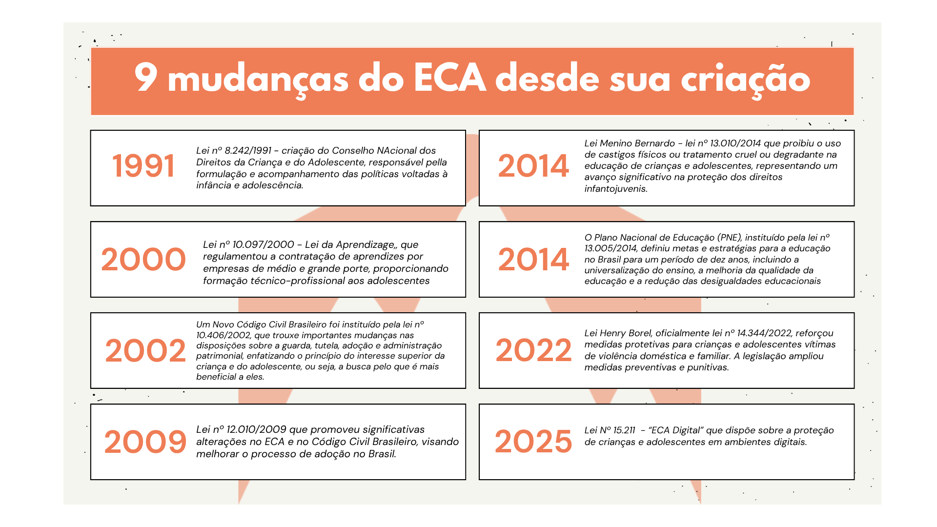 O Estatuto da Criança e do Adolescente (ECA) por meio da Lei nº 8.069/1990 é um marco legal no avanço da proteção das crianças, motivado pela Convenção sobre os Direitos das Crianças de 1989, adotada pela Assembleia Geral da ONU e ratificada pelo Brasil, que completou 35 anos em julho deste ano.