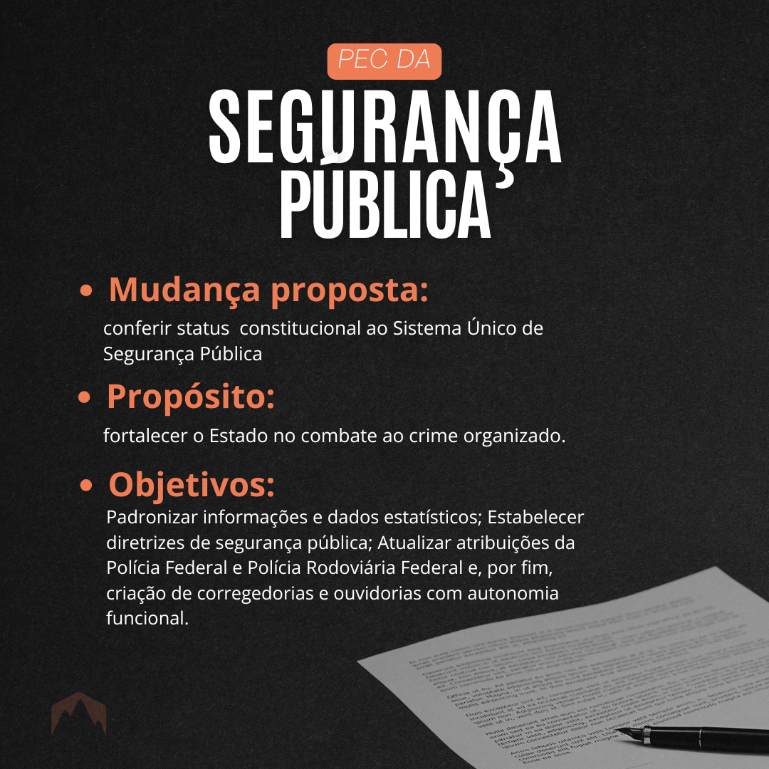 Em tramitação na Câmara desde abril, a PEC da Segurança é a principal aposta do governo Lula para dar uma resposta ao problema da segurança pública no país. O texto altera cinco artigos da Constituição (21, 22, 23, 24 e 144) que aumentam o papel da União na elaboração de diretrizes de políticas de segurança pública dos estados.