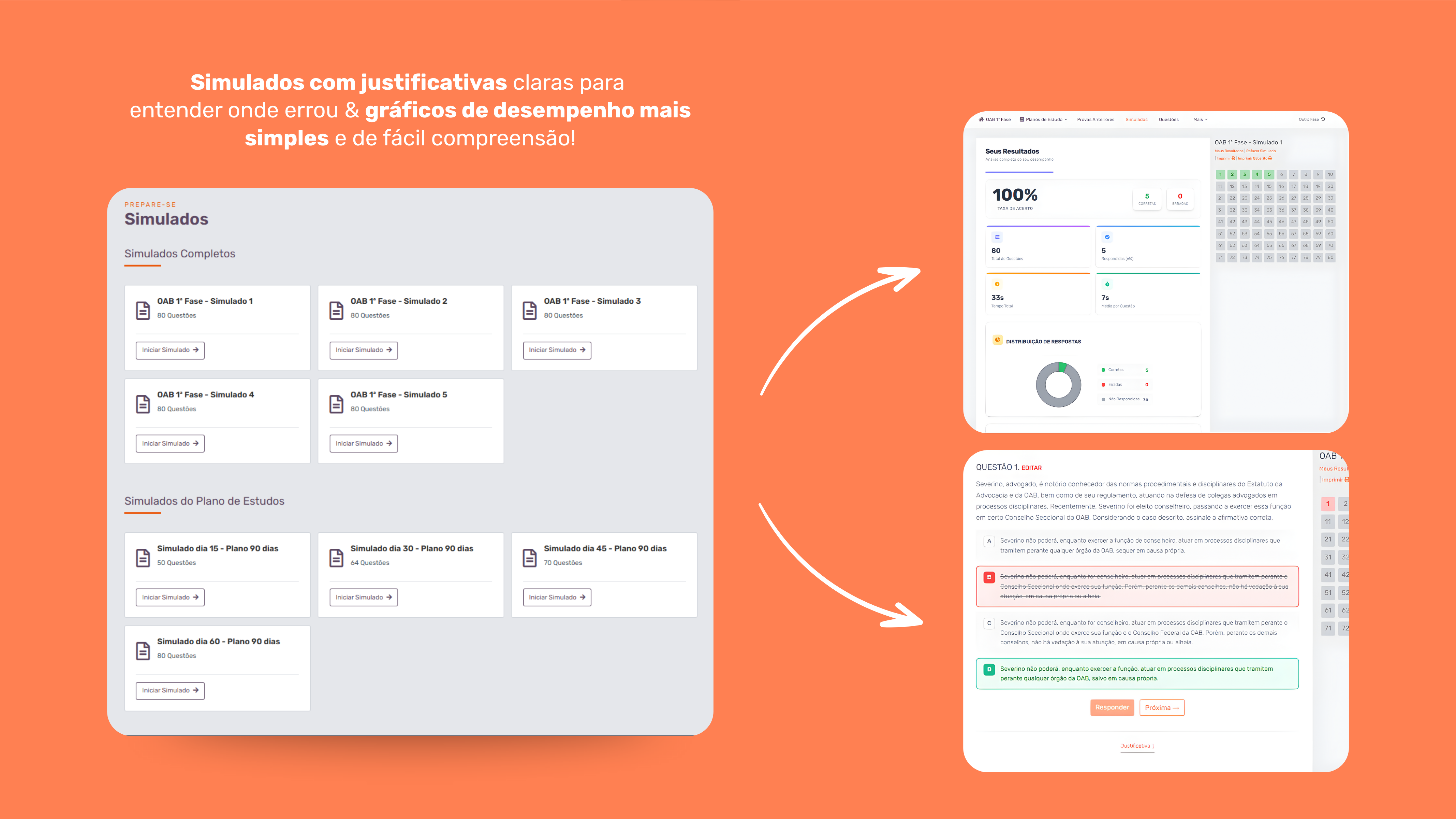Área de Simulados: Um design focado na resolução de questões, com painéis de resultados claros e justificativas fáceis de ler.